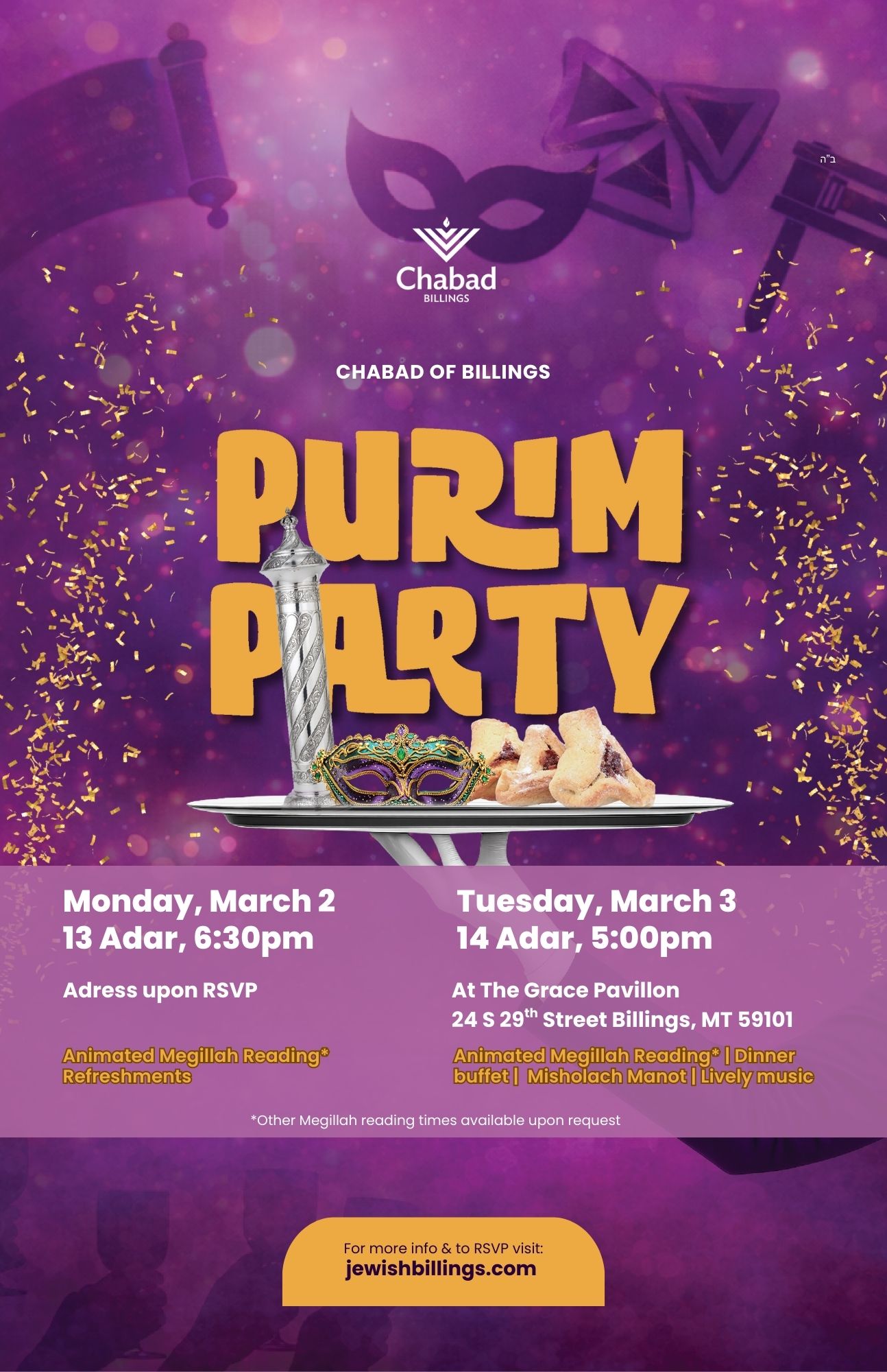 Celebrate Purim and experience the reading of the Megillah. Followed by a Buffet Dinner for the ages!